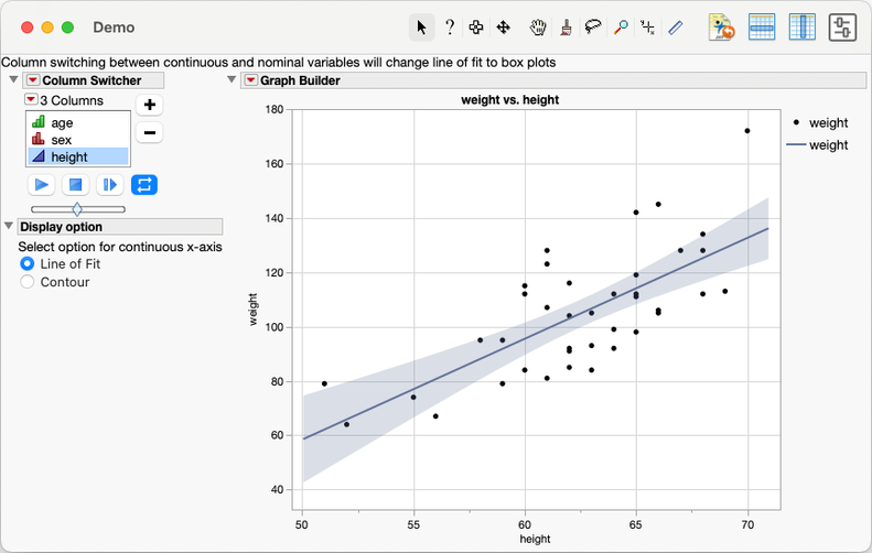This recipe shows how to change the element type in Graph Builder dynamically, depending on whether the user selects a continuous or categorical x-axis variable in the Column Switcher. Elements are the graph types that appears as icons at the top of the Graph Builder palette. For continuous inputs, a radio button is added letting the user select between a Line of Fit and Contour. This recipe is useful when creating interactive charts for people who are not JMP experts and only need a limited number of options.