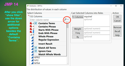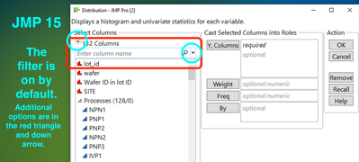 Many people have lots and lots of columns, and the structure of JMP is such that you have to choose your columns in the launch dialog for an analysis. Do you struggle to find your columns? There is a filter that is very helpful for finding the column you want when you start an analysis. I'm going to show how to do this in JMP 14 and JMP 15, since they are slightly different.