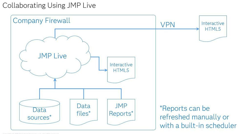 A: You are going to have some database historian (a Pi server or LIMS database, for example) that accumulates data. JMP will query that and the query will be stored in a PostgreSQL database that's in the JMP Live instance. JMP Live will make a direct copy of the data that is not editable . So, for pharmaceuticals, for example, you remain 21 CFR Part 11 compliant because your original data, your point of record, is somewhere else, not in JMP Live. JMP Live is working on a copy. After updates, reports refresh according to the schedule you determine.