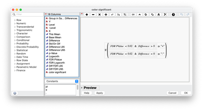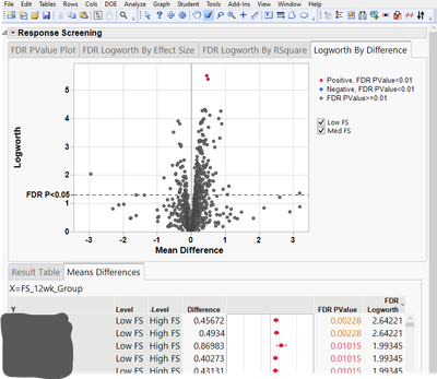 - For JMP Pro 17 or JMP Pro 18 (released in March), this is currently not possible. I do something similar as you did. I save out the Means difference table (Red Triangle within Response Screening and choose Save Tables>Save Means Differences) and then use graph builder with a local data filter. I also will use Rows>Row Selection>Select Where to select rows that are below a threshold of choice and difference threshold. Then I use Rows>Row Selection>Name Selection to Column to create an indicator column(s) that I can use to concatenate for a column I can use in the color option in graph builder. Another option is to use a column formula where the conditions are added and an if statement. I like this option better since it is a single action and saved within the column as to what I am doing.