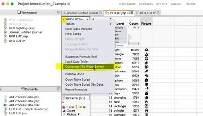 Reminder: When finishing your work, save each table/file and then Save the Project. Files listed in Workplace will not open as files when you reopen/unzip a Saved Project. Those Workplace files will unzip as .jsl scripts.