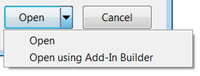 • To edit an add-in use File > Open, then click the arrow next to Open and select Open Using Add-In Builder (on Mac, first click “Options” then check “Edit after opening”).