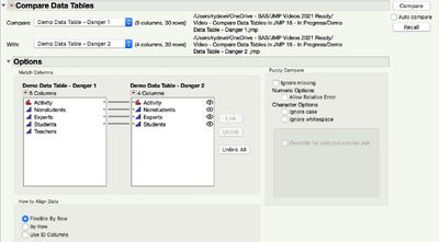 Beginning with JMP 16, JMP offers the ability to interactively compare data tables by comparing columns with different names showing the results in a table.