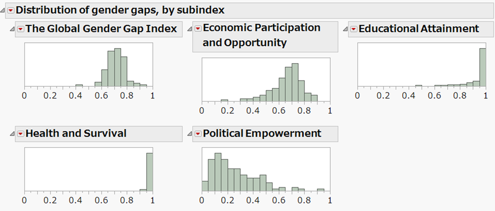 ジェンダーギャップ指数も含め、4つのサブカテゴリに対するスコアの分布を示します。