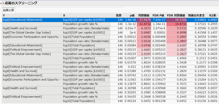 JMPでは「応答のスクリーニング」プラットフォームで上記のYとXを指定すると、すべての組み合わせについて、統計量をまとめたレポートを表示することができます。