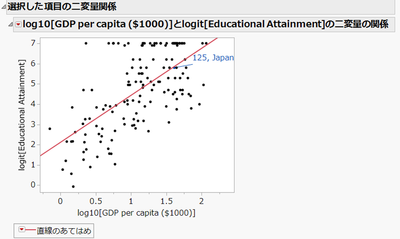 1人当たりのGDPが高くなるほど、教育に関するスコアは上昇する相関関係が読み取れます。ただし、GDPが低くてもスコアは高い国もあり、回帰直線ではそれらの関係を説明できていないことに注意が必要です。