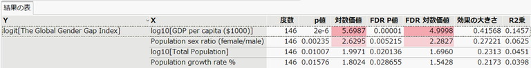 - 左下の4パラメータモデルは、4つの指標を説明変数にしたときのレポートです。検定の有意水準5%としたときGDP, 男女比、人口の3つが有意になっています。