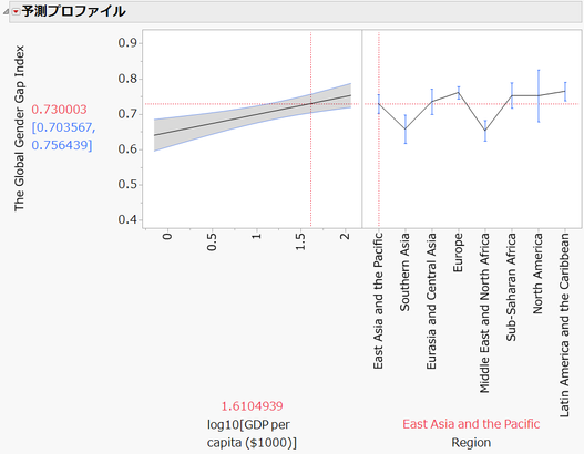 このモデルで、"地域"と"一人あたりのGDP" でジェンダーギャップ指数の約44%説明できていることになります。ほかにもジェンダーギャップの要因としてはほかの社会的な要因、国特有の要因などが考えられそうですので、2つの要因で44%ぐらいであれば、まあまあ説明できているのかなといった感じです。