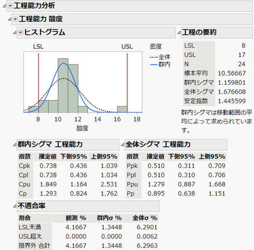 JMPのサンプルデータ「Pickles.jmp」に対して、連続尺度の列「酸度」について「一変量の分布」で仕様限界(下側 = 8、上側 = 17)を設定し、工程能力分析を実行すると、次のレポートが表示されます。