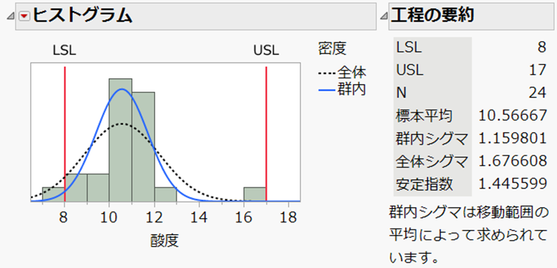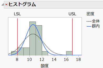 Yに指定した列「酸度」に対するヒストグラムが、指定した仕様限界線(赤色の実線)とともに表示されます。このグラフにより、視覚的にLSLを下回るものやUSLを上回るデータがどれぐらいあるかを確認できます。