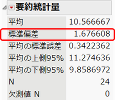 全体シグマは、データから計算される標準偏差で計算されます。「要約統計量」の標準偏差の値と一致していることが確認できます。
