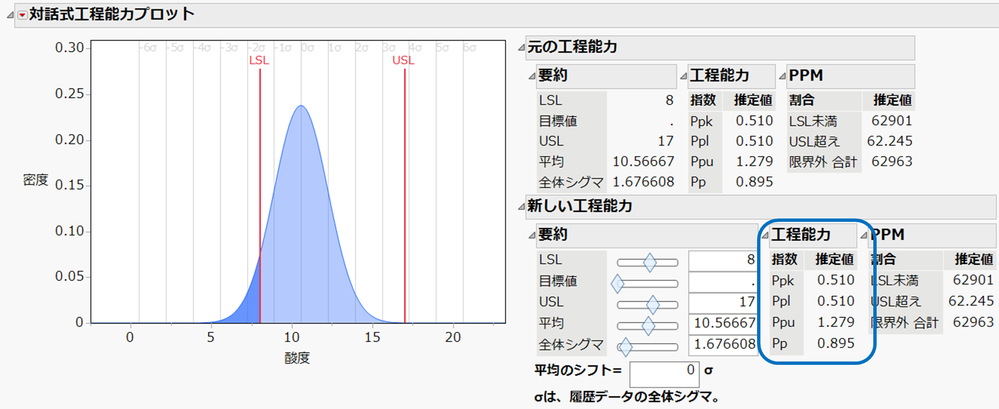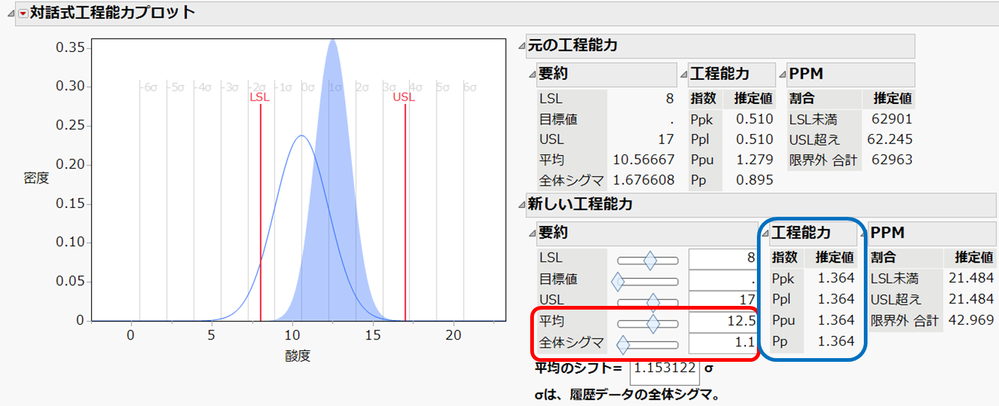 これにより、Ppk は1.364に向上し、よく用いられる目安の値 1.33を超えていることになります。