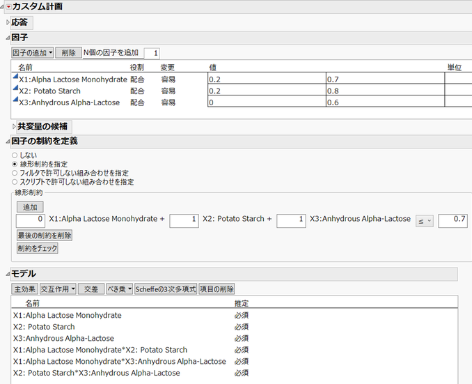 JMPの「カスタム計画」を用いて、上記の配合因子の条件を設定します。この例では、配合因子の主効果と2次の交互作用を含めたモデルとし、実験回数は12回とします。