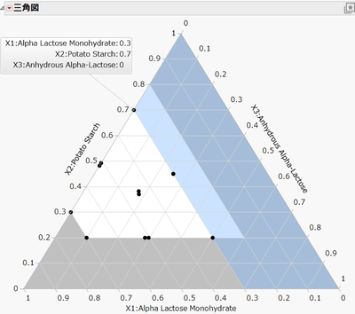 作成された配合実験の計画を「三角図」プラットフォームを使って視覚化します。三角図の灰色の領域は各因子の取りうる値の範囲外であり、水色の領域はX2 + X3 ≦ 0.7 を満たさない領域です。すなわち、三角図の中で白色の領域が、この例での実験空間となります。