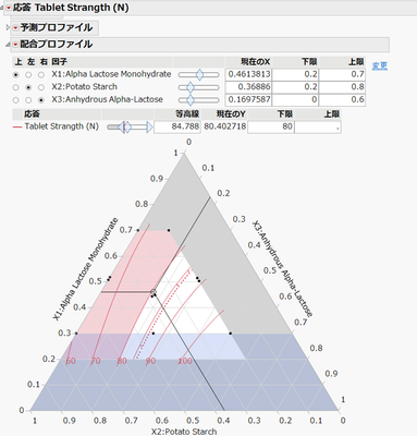 実験が終了したら、「モデルのあてはめ」プラットフォームを用いて配合モデルをあてはめます。「モデルのあてはめ」では、[配合プロファイル]というオプションがあり、ここでも三角図に相当するものを描くことができます。