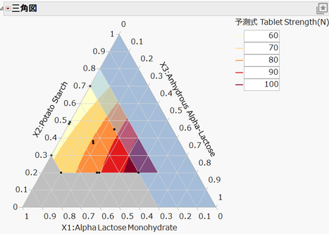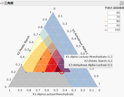 これらの操作で、三角図にグラデーションをつけた等高線を含めることができました。錠剤硬度を高めたい場合は、濃い色の領域の配合割合を検討することになります。例えば、実験領域の右下である X1: 30%, X2: 20%, X3:50% は、錠剤硬度の予測値が最も大きくなる点なので、これらの配合割合で錠剤を作成し、硬度を測定し、大きな硬度が再現できるか確かめる方法が考えられます。