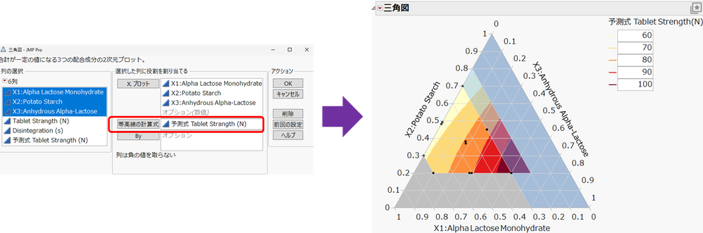 - [グラフ] > [三角図] を選択し、[X, プロット] に配合因子の列(3つ)を、[等高線の計算式] に保存した予測式を含む列を指定します。