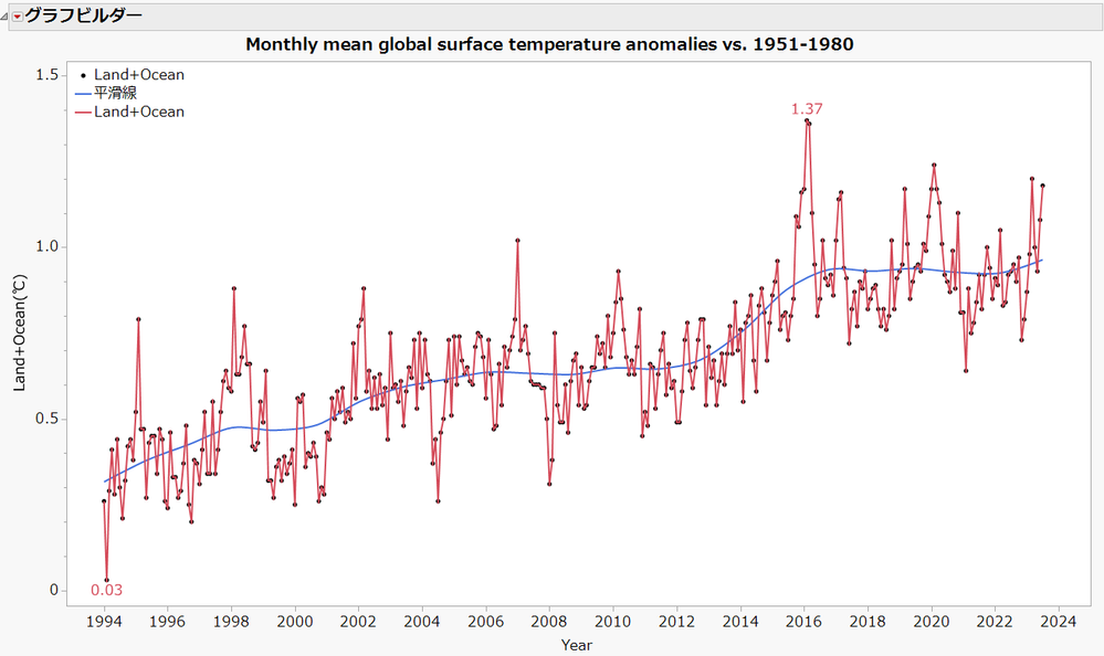 平滑線(青色の線)も見ると、気温差が上昇傾向にあることは明らかです。ただ局所的にみると、上昇幅が大きかったのは2014年から2017年あたりとなり、ここ数年はそんなに上昇しているわけではないことがわかります。