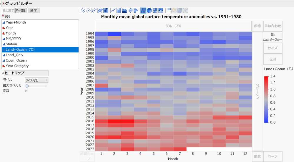 カラーマップの横方向(年)を比較すると、やはり以前から現在にかけてどんどん暑くなっていることがわかりますし、縦方向(月)を比較すると、近年では1月から3月が暑くなっていることがわかります。
