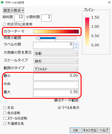 - 最小値、最大値の変更:この例では0以上の値しかとらないことがわかっているので、値の最小値を0としています。