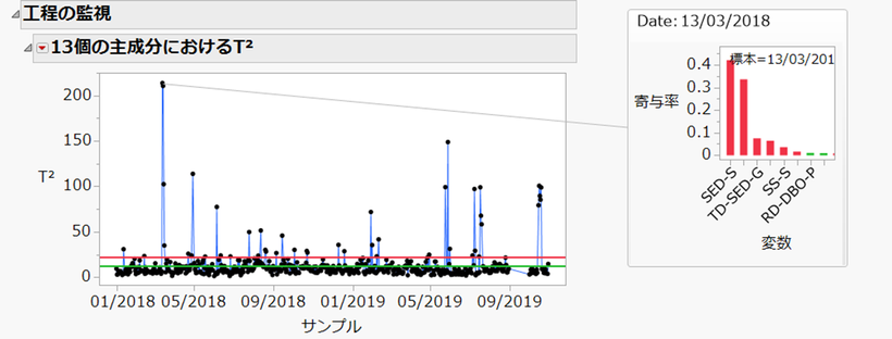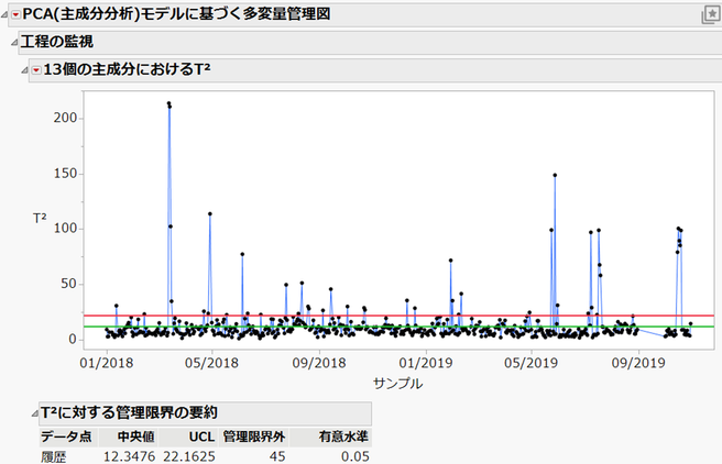 このレポートでは、47個の変数から抽出した13個の主成分におけるT²が示され、主成分スコアによる多変量管理図が描かれます。