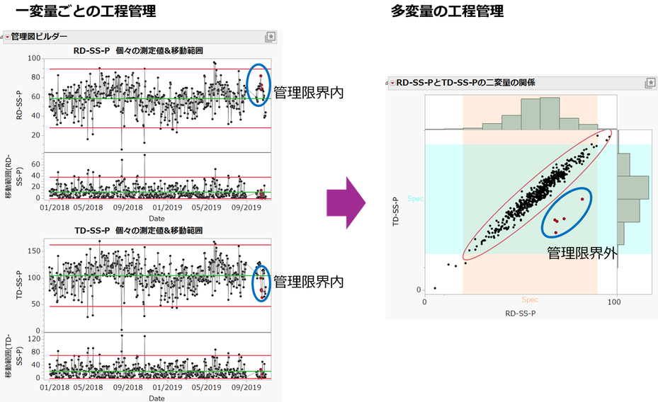 赤色の点を参照すると、一変量ごとの管理図では管理限界内に収まっていたデータが、多変量(この例では二変量)の工程管理では、相関を考慮した確率楕円の外側に位置している、すなわち外れているデータであることがわかります。