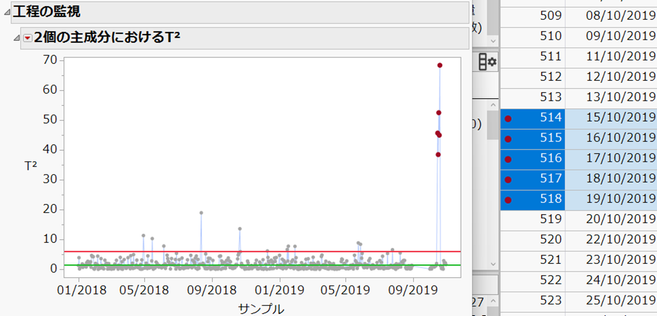 されに、管理図上で赤色の点をすべて選択しデータテーブルに戻ると、これらの点が2019/10/15~2019/10/19の間のものであることがわかります。この期間に工程へ影響する要因があった可能性が考えられます。