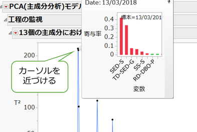 多変量管理図で管理限界外になった点を確認 ⇒ グラフ上で該当の点を選択