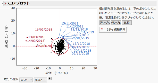 信頼楕円の外に位置する点を確認すると、第1主成分軸の左側には2018/3/13〜2018/3/16のデータがあり、第2主成分軸の上側には2018/12/10〜2018/12/13のデータがあることがわかります。