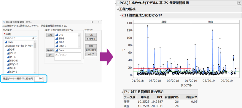 「モデルに基づく多変量管理図」では、過去のデータ(履歴データ)に基づいて、現在のデータに管理図を適用することも可能です。