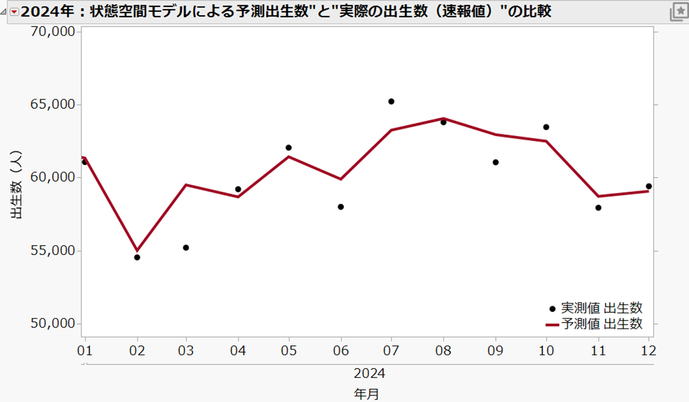 出生数には季節要因が大きく影響するため、月ごとに予測しています。ここでは2024年の状態空間平滑化モデルによる出生数予測と実際の出生数とを比較してみます。