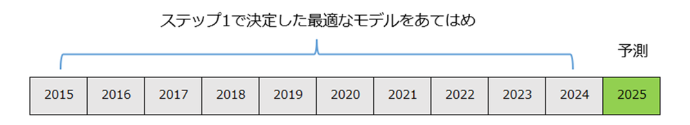 ステップ1で決定した最適なモデルを2015年から2024年のデータに対してあてはめ、2025年を予測する。
