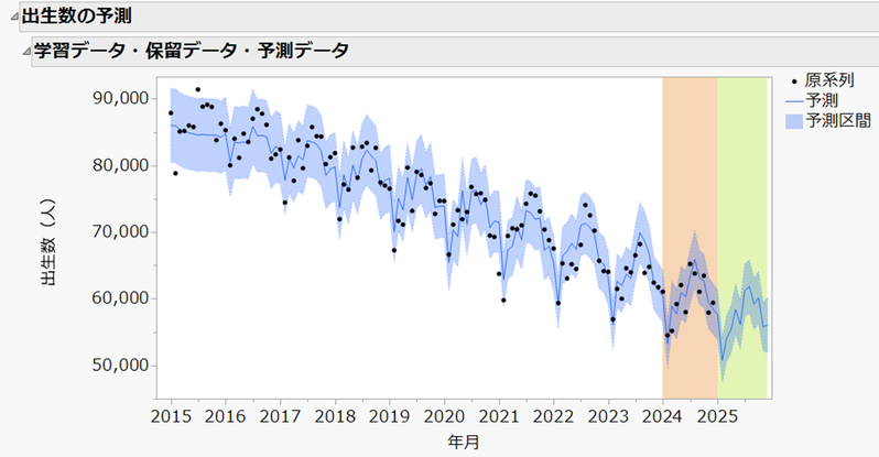 この手順で求められた最適なモデルを用いた予測結果を以下に示します。図のオレンジ部分が2024年の検証データ、緑部分が2025年の月ごとの出生数予測です。