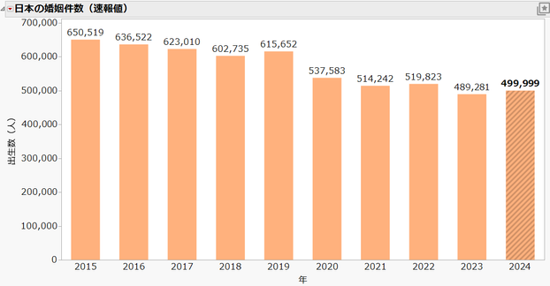 昨年(2024年)の婚姻件数は、一昨年(2023年)と比べて2.1%増加(約1万人増)したことがわかりました。