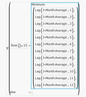 ⅱの過去12か月間の3か月移動平均の最小値は、Lag(x, n) 関数を使っています。nは列xのn時点前の値を返します。ここでは1時点前から12時点前の3か月移動平均の中で最小値を求めます。