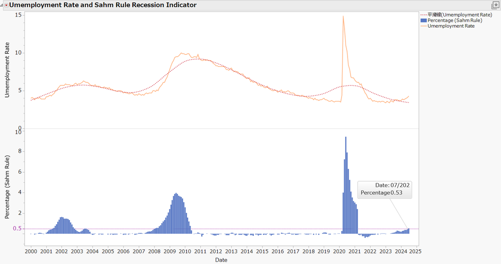 値が求められたので、「グラフビルダー」を使って失業率(グラフ上側)、サームルールによるパーセンテージ(グラフ下側)の推移を示します。