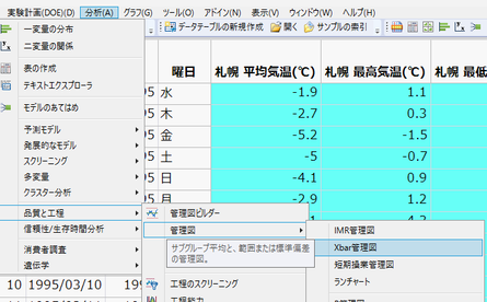 JMPでXbar管理図を描く際、下図のように深い階層をたどって選択する必要があります。