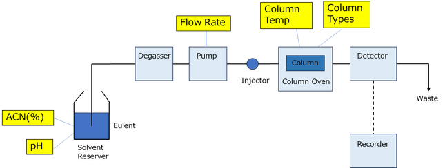 例えば、以下のようなHPLCの構成において、最適な操作条件を求めることが、分析法開発の一例として挙げられます。