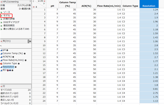 - 最適計画に基づく24回の実験が提示されるので、実験を実施し、応答(分離度)の値を入力します。