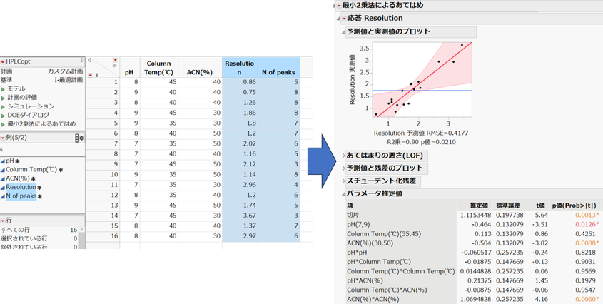 本例では、重要な因子として、「pH」、「ACN」、「Column Temp」、「pH*Column Temp」 が選ばれました。
