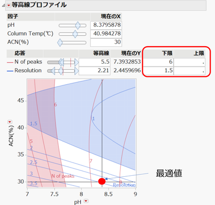 下図は、最適化の条件における等高線です。Column Temp = 40.98℃に固定し、pHを横軸、ACNを縦軸とした場合、白色の等高線領域が仕様を満たす範囲です。この領域には、[満足度の最大化]で求めた最適値も含まれています。