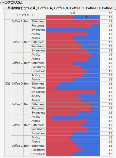 以下のシェアチャートが評価した結果を集計したものです。値"1"はチェックした、値"0"はチェックしなかったことを示します。要は各コーヒー、各特徴(Item)について、1の割合が多いほどその特徴を強く感じたパネリストが多いことを示します。
