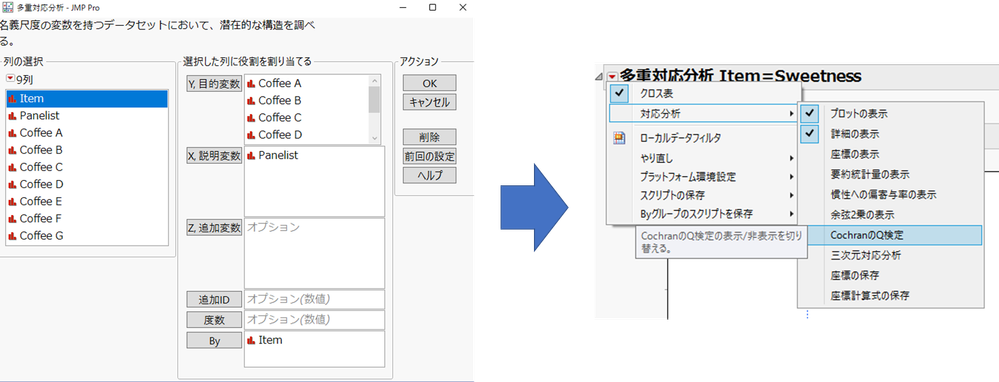 [分析] > [多変量] > [多重対応分析] を選択し、左下図のように列を割り当て、表示される分析レポート左上にある赤い三角ボタンから [対応分析] > [CochranのQ検定] を選択します。