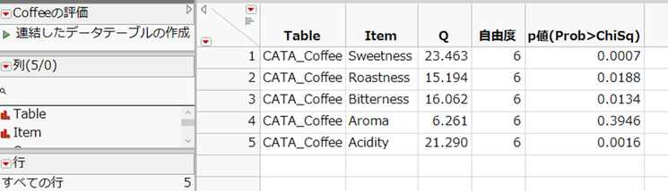 実際は、5つの特徴(評価項目)についてCochranのQ検定を行っているので、右クリックメニューから [連結してデータテーブルの作成] を選択し、一つのテーブルにまとめたものを示します。