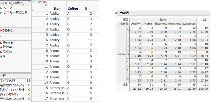 前述したデータをItem, Coffeeについて度数集計し、集計したデータについて対応分析を実施してみます。CoffeeとItemの二元分析表に基づいて対応分析を行い、製品と評価項目との関連性を調べることが目的です。