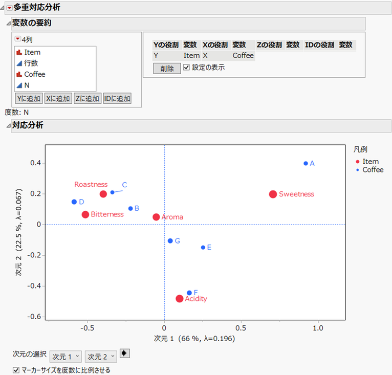 対応分析では各コーヒーについて"0"と"1"の点がプロットされていますが、Bitternessは0と1が近くに位置しておらず2次元上に混在しています。これは、製品間で評価に類似性がない状態です。一方、Aromaについてはおおむね "0"が左側、"1"が右側にある程度まとまって位置しているので評価に類似性がある状態といえます。評価に類似性があるということは、製品間の差が見いだせないことを示しています。