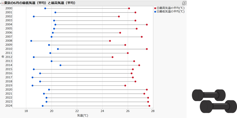 このように、2つの数値(例:最低気温と最高気温)を線で結ぶことで、ダンベルのような形になることから、このグラフは「ダンベルチャート(Dumbbell Chart)」と呼ばれています。