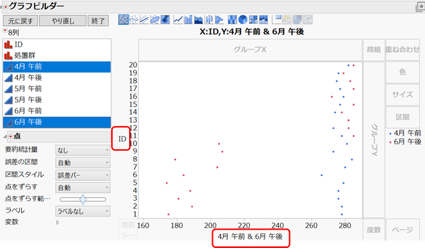 1. 「ID」を [Y] ゾーンに、「4月 午前」と「6月 午後」を同時に選択し[X] ゾーンにドロップします。