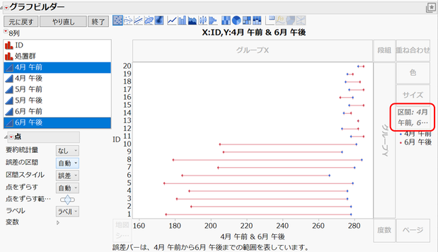 ここでは、「4月 午前」から「6月 午後」の変化を、ダンベルチャートで示してみます。