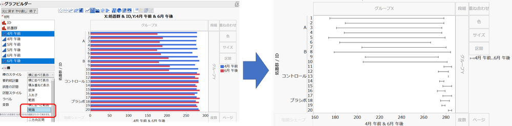 本記事では、JMPの「グラフビルダー」を使って、このダンベルチャートを作成する方法をご紹介します。